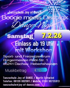Ab 19.30 Uhr beginnen wir mit einem kostenlosen Discofox Workshop mit Marlit und Markus den Tanzabend, gegen 20.30 Uhr starten wir dann voll durch- open End, frei nach dem Motto: „Der letzte macht das Licht aus.“